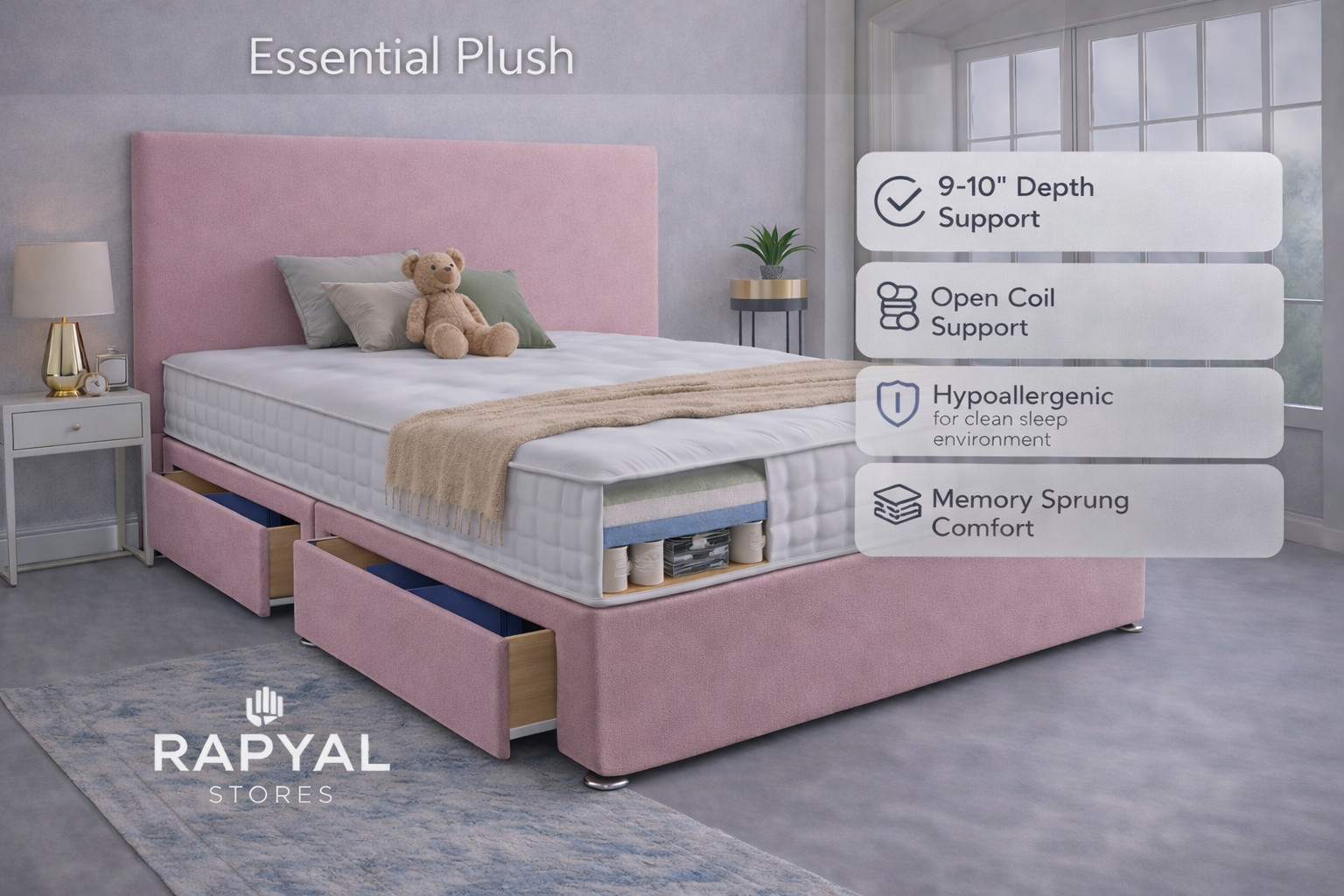 🔥ESSENTIAL PLAIN PLUSH DIVAN BED SET. Type: Divan Bed Set. ✔Modern Plain Headboard (24") – simple, clean design. Base Type: Divan Base. 🎯PLAIN HEADBOARD DESIGN. Headboard Style: Plain. ✔Soft Plush Fabric Finish – smooth premium feel.