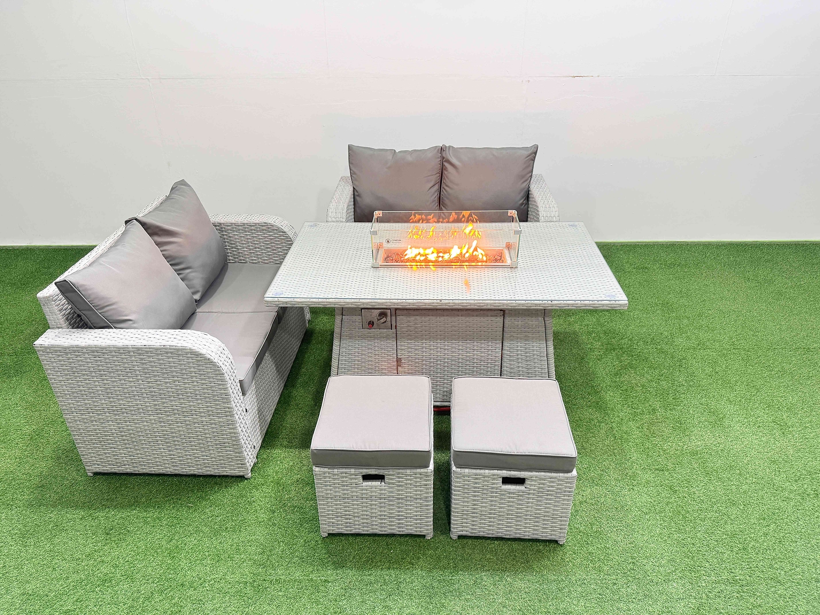 • Firepit Dining Table Size: 140L x 80W x 69H cm. 4 Seater=2 Love Sofa+1 Firepit Dining Table. 4 Seater+1 Side Table=2 Love Sofa+1 Firepit Dining Table+1 Side Table. 4 Seater+2 Side Tables=2 Love Sofa+1 Firepit Dining Table+2 Side Tables.