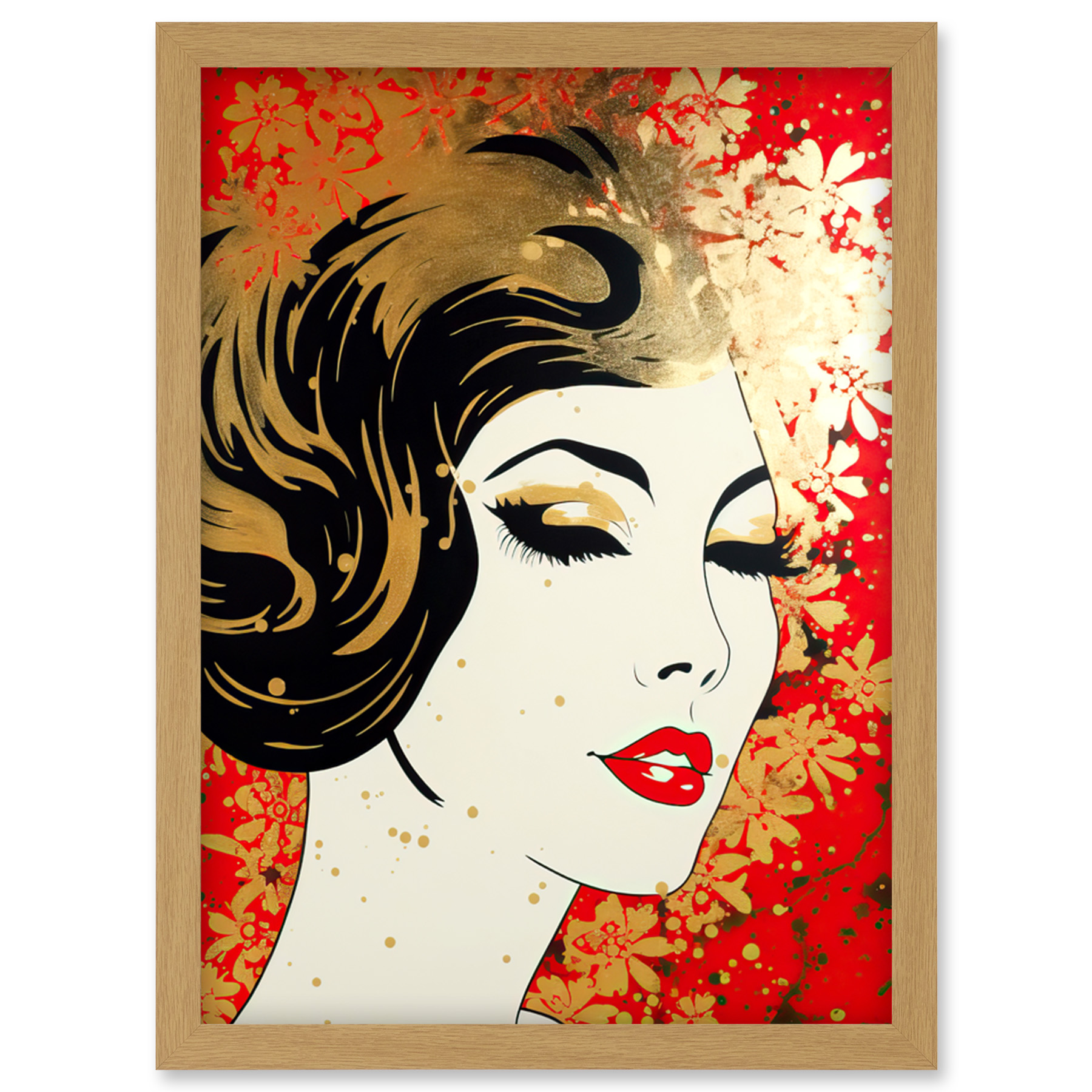 Woman Face Retro Glam Aesthetic Gold Flower Pattern Red Portrait Huge Art Poster