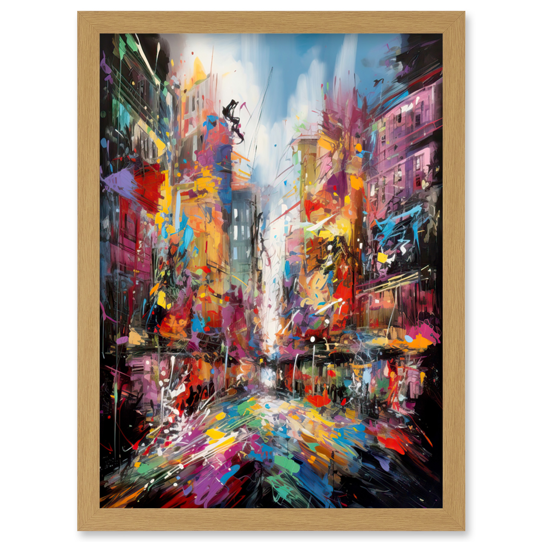 Artery8 Abstract City Street Modern Vibrant Cityscape Artwork Framed Wall Art Print A4 in Light Oak Light Oak