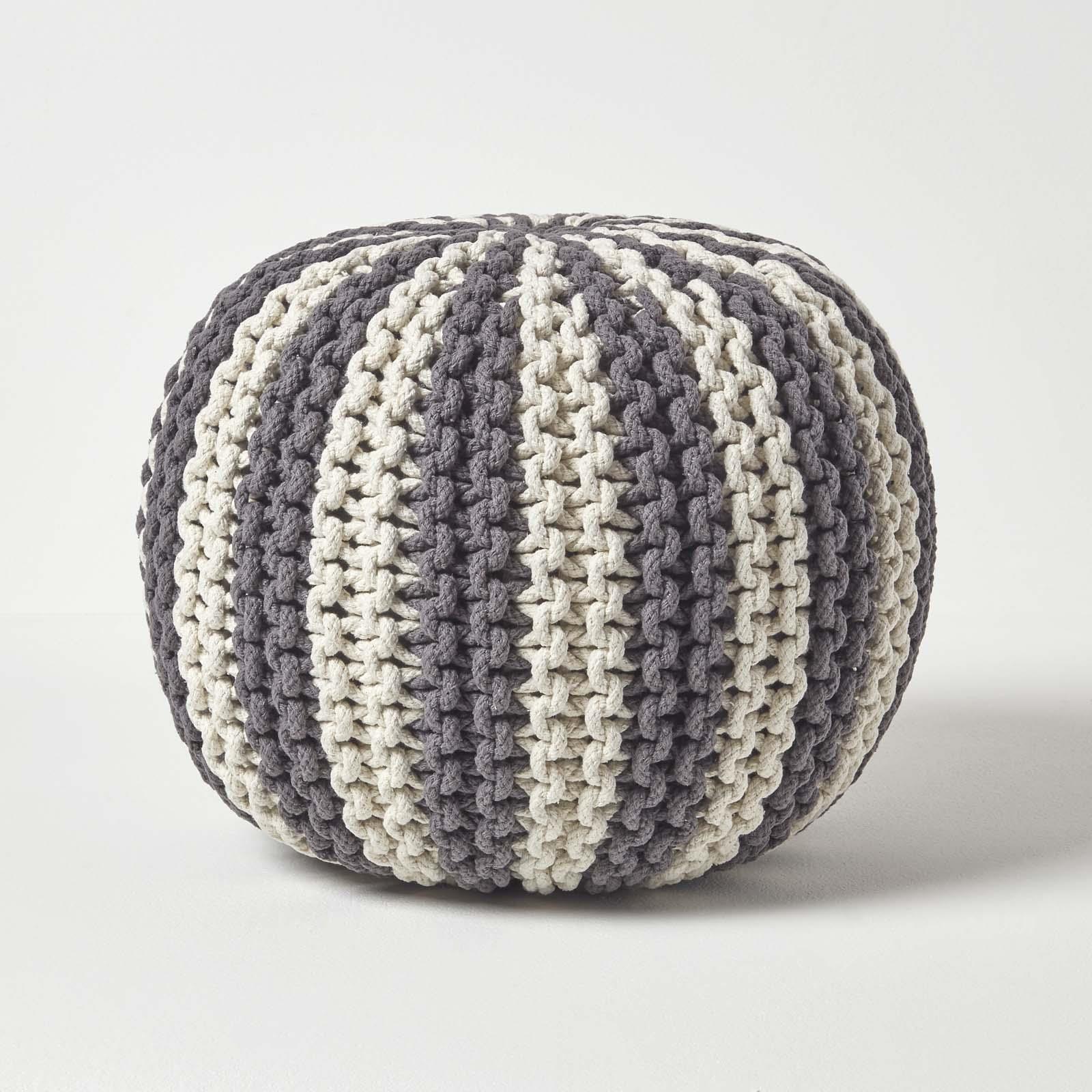 Woven from chunky knit cotton, these multi coloured striped footstool are the perfect addition to any room. Knitted pouffe that will brighten up any living space or nursery, while acting as a footstool, extra seat, table or more.
