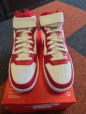 GENUINE NIKE AIR COURT BOROUGH MID TRAINERS. FREE DOUBLE BOXED UK DELIVERY, ANY QUESTIONS PLEASE ASK. Look like an all star off the court with the Nike Court Borough Mid. The classic mid-top design features durable leather for a premium look and feel. Padding around the tongue and ankle provide extra comfort. Benefits Leather is durable and easy to clean. Traditional laces provide a secure fit. Grooves in the sole make it flexible. Padding around the tongue and ankle give you extra comfort. Product Details….. Cupsole construction for a classic look and feel Product colour: White/Obsidian/University Red