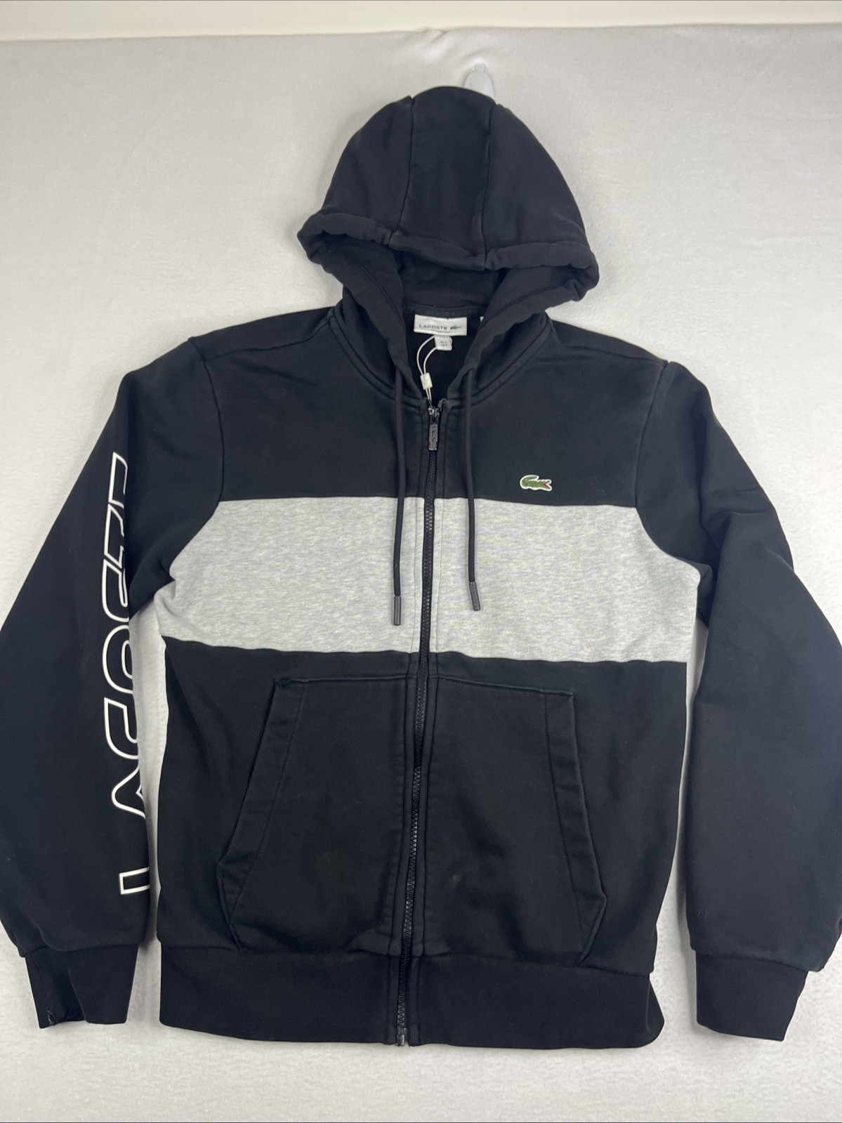 The NWOT Lacoste Colorblock Zip Up Hooded Sweatshirt is a stylish and comfortable fleece hoodie in size small. Made from a blend of polyester and cotton, this hoodie features a solid black color with the iconic Lacoste logo accent. With a full zip closure, long sleeves, and a hood, this hoodie is perfect for sports enthusiasts and casual wear during the winter, fall, and spring seasons. Whether you're walking or just lounging around, this hoodie provides both warmth and style.