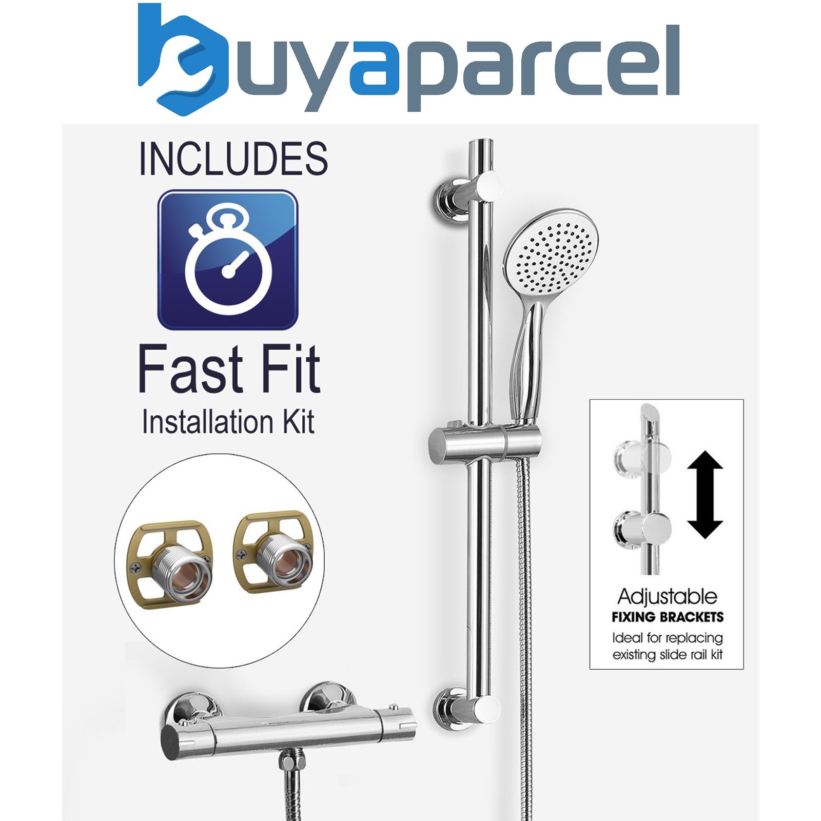 This solid brass round thermostatic exposed shower mixer is a sleek and modern design and a cost effective showering solution. This shower set is fully thermostatically controlled, with Separate Flow and Temperature controls allowing you to tailor the shower to your preference. The left diverter controls the water the water on/off and the water flow and the diverter on the right controls the temperature which has a safety stop preset as a set temperature of 38 degrees C. for comfort and safety. The slider rail also comes with an adjustable bracket for the handheld shower allowing you to change the angle of the the handset and move it up and down to suit your preference. Includes a Fast Fit Installation kit - This kit removes the need for in wall support battens. Reduced chance.
