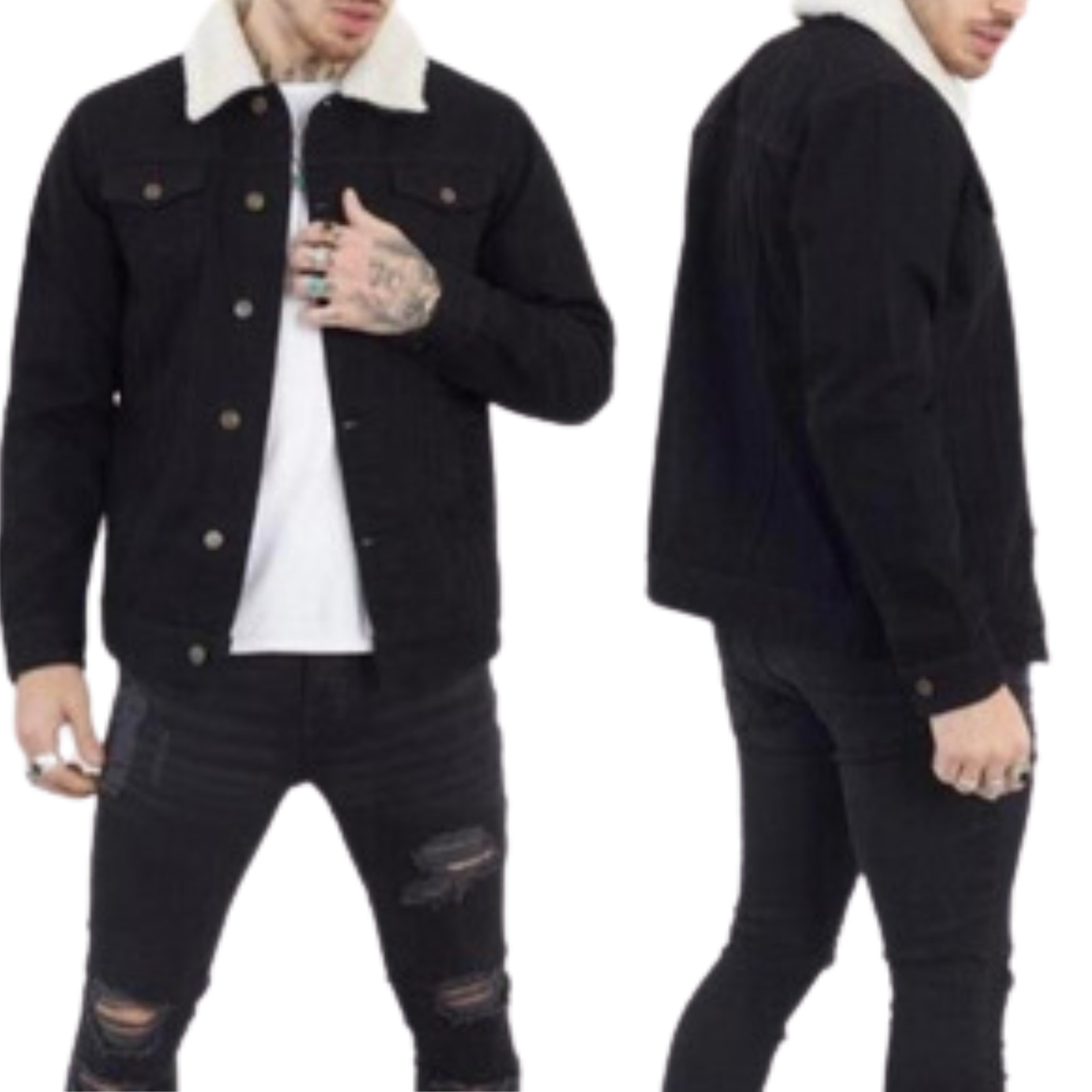 The model is wearing a UK size M. Features: - Detachable Borg Collar, Pockets, Warm. Available Color: Denim Light Blue & Denim Black. Wear With: - Layer over jeans and a t-shirt (But Not Limited). Material: 100 % Cotton.