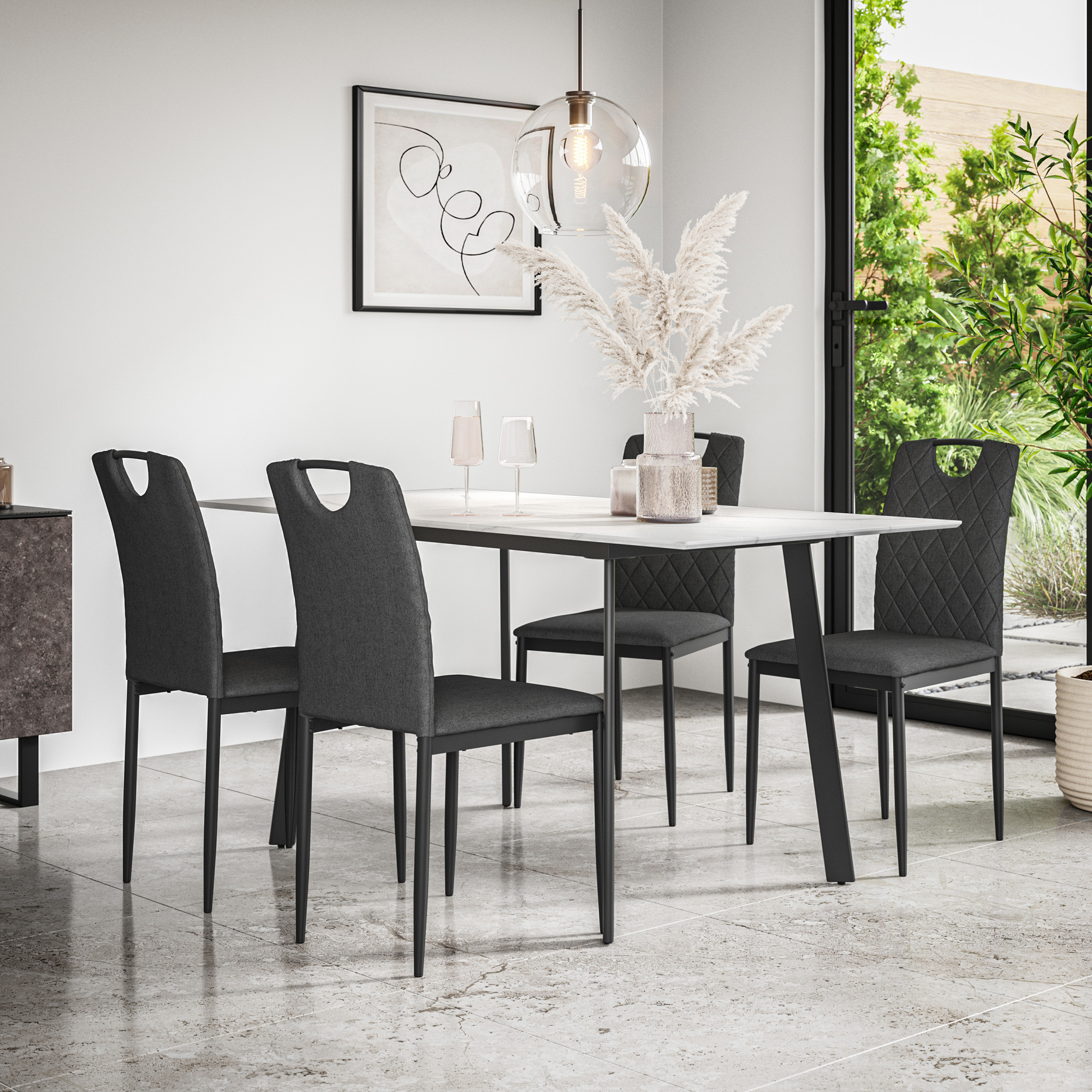 HAYDON EXTENDING DINING TABLE + CHAIRS - WHITE MARBLE EFFCT TABLE TOP w BLACK LEGS + MONZA DINING CHAIR. HAYDON EXTENDING DINIG TABLE + CHAIRS- WHITE MARBLE EFFCT TABLE TOP w BLACK LEGS. The Haydon Dining Table can seat 4-6 people, and yet its compact rectangle shape is perfect for maximizing space while creating an inviting and intimate dining experience.