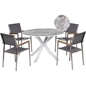 Stylish Garden Dining Set. This stylish garden dining set includes a spacious round table and four chairs, making it ideal for those who love hosting gatherings. The table, crafted from lightweight yet robust aluminium with a ceramic glass table top and marble effect, offers ample space for dining essentials, and sturdy stainless steel chairs with a fabric seat guarantee comfort. Its neutral colour palette provides versatile styling options, and UV, light water, stain, and rust-resistant materials ensure durability. Details: Product Type: Dining Set Style: Modern General Color: White, Silver, Grey Shade: White Marble Material Type: Metal Main Material: Aluminium Additional Material: Plastic Wood Top Material: Metal Finish: Powder Coated Seats Up To: 4 People Dimensions: Chair Dimensions: 55x58x87 cm Seat Height: 44 cm Table Dimensions: 120x120x75 cm Overall Dimensions: 120x120x75 Weight: 54 kg Chair Weight Capacity: 160 kg Table Weight Capacity: 70 kg Offer Includes: 4 x Chair, 1 x