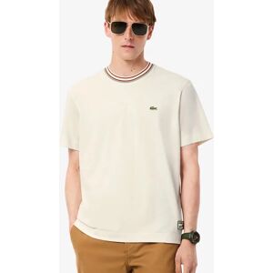 This T-shirt is the fruit of 90 years of Lacoste elegance and knitwear expertise. Made in France from comfortable cotton jersey with a contrasting striped neckline, with knit detailing for added texture. A sophisticated piece, finished with a logo badge and embroidered signature crocodile. Lightweight organic cotton jersey Classic fit, comfortable sleeves Contrast knit stripes on collar Lacoste Made in France badge at waist Sewn-on embroidered crocodile on chest Main fabric:Cotton (100%) / Neckline Rib:Cotton (80%),Polyester (19%),Elastane (1%)