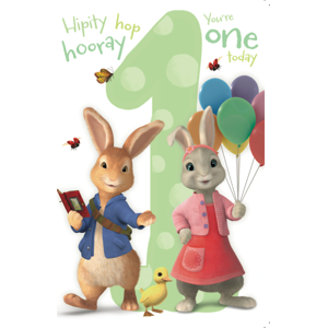 Peter Rabbit Age 1 Birthday Card This popular CBeebies CGI animated TV series is based on the works of Beatrix Potter and follows the‚ mischievious Peter Rabbit‚ and‚ his fun‚ adventures‚ with friends.‚ The message says‚ "Hipity hop hooray. You're one today." The message says "Ears wishing your 1st Birthday is super special... just like you! With lots of love." The cover of the card adopts a mint green colour scheme, on the writing, with Peter Rabbit and Lily Bobtail holding balloons and a book, surrounded by ladybirds and butterflies! ‚ Plus there is‚ lots of space to write your own message and this card comes with an unsealed envelope. Order‚ your‚ Peter Rabbit Age 1 Birthday‚ Card‚ before 2pm‚ Monday to Friday and receive delivery.‚ Worldwide delivery is also available.