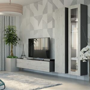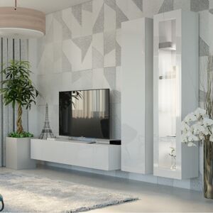Mila III is a statement that defies gravity in a 3-piece set that starts with a floating TV stand with two compartments. This modern piece is complemented by two large vertical cabinets, one of which has a glass door. This is a three-piece set that can be utilized in many creative ways. EUSGroup Colour: White/Grey