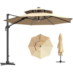 Keep yourself protected whilst enjoying the sun all-day long with this large Cantilever parasol from Outsunny. The polyester canopy provides protection from direct sunlight and heat. Using a crank mechanism for effortless opening and closing, the canopy can rotate a full 360 degrees to keep you covered all-day long. Powered by panel solar, the LED lights on the ribs can provide you more lights at night. The perfect blend of beauty and function.Features:Suitable for garden, patio, poolside, and more outdoor areasWith solar panel and LED lamp beads for lighting up your nightCanopy rotates 360 degrees by the pedal to cover you all day longEasy and quick to open and close the umbrella with side crank handleFour-position tilt canopy with its adjustable angle to suit your preferencesTop vent allows air and heat to flow in and out more easilyEight connecting ribs for extra stabilityAssembly required