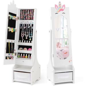 Delight your little princess with our jewelry armoire cabinet! The top unicorn shape will appeal to your child. The clear full-length mirror with 2 tilt angles brings your little one a head-to-toe view. It also has 18 earring slots, 13 hooks for bracelets and necklaces, 64 ring slots, 3 storage shelves, 1 interior drawer, and 1 foldable fabric drawer. Kids can store their jewelry, nail polishes, and toys according to their daily needs. To keep it safe and sturdy, the standing jewelry cabinet also has an anti-toppling device and solid base. Costway Kids Jewelry Cabinet Standing Children Jewelry Organizer w/Drawer-White in White