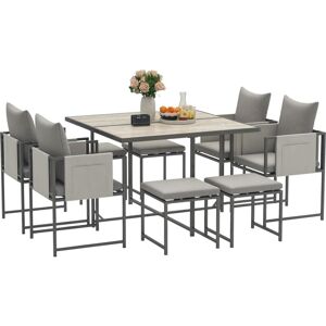 Create a go-to dining space in the garden with this Outsunny outdoor dining set. Powder coated steel frames mean a strong core for all pieces, with cushions on the chairs and stools for comfort. The cubic shape allows the chairs to be tucked away under the table -saves space when the balcony furniture set isn't being used. The PSPC plastic tabletop ensures a tough dining surface, finished with a beautiful wood effect. OUTSUNNY 8 Seater Garden Dining Set, Cube Garden Furniture with Cushions in Grey