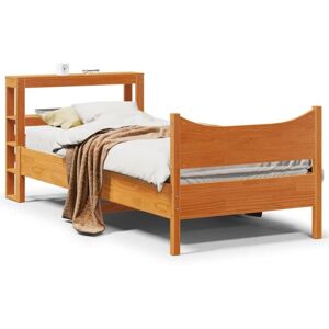Get a better restful night's sleep from this bed frame! It makes a welcoming addition to any bedroom. Stable and long-lasting frame: Solid pinewood is known for its strength and durability. Its straight grains and distinctive knots contribute to its rustic charm.Slatted base for optimal support: The bed frame is equipped with a slatted base for support and breathability for your mattress.Ample storage space: This sleek headboard of the bed features two convenient shelves, offering ample storage space to keep all your nighttime essentials within easy reach.Freestanding headboard: The freestanding headboard offers a hassle-free solution for effortless placement and repositioning without the need for wall installation. Good to know:A mattress is not included with this bed. We do offer a various selection of mattresses. You can check our shop for a matching mattress. Colour: Wax brown Bed frame material: Solid pinewood Slat material: Plywood Overall dimensions: 212.5 x 81 x 82 cm (L x W x