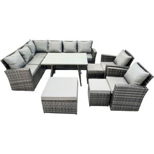 This patio corner sofa set can be used both indoors and Outdoor, with high quality PE rattan and durable galvanized steel construction for sturdiness and long lasting. Outdoor garden furniture can also be placed on the patio or balcony, The design of this rattan furniture is a perfect blend of country chic and modern minimalism, adding an elegant touch to your house. Set dimensions: 1 x 3 Seater sofa with two arm : 170L x 69W x 79H cm; 1 x 3 Seater sofa with single arm: 160L x 69W x 79H cm; 1 x Rectangular Dining Table :110L x 70W x 70H cm; 1 x Big Footstool :65L x 65W x 34H cm; 2 x Small fully assembled footstools 40L x 40W x 34H cm; 2 x Chair: 74W x 69D x 79H cm; Dark Grey Mixed rattan with dark grey fabric .Color may vary due to light or monitor .we are unable to return the item due to this problem .Please consult before purchase if you have requirment on color saturation. Items Comes Flat Packed And Easy to Assemble, Sturdy Galvanized Steel Tube Metal Frames With Powder Coating To Prevent Rust. Ergonomic High Back And Declining Design For Extra Comfort. Flat PE Rattan Completely Made By Hand, 5mm Thick transparent Tempered Glass With Sucker On Surface To Prevent Sliding8 cm Thick Seat Cushion With Soft Back Cushion provide You with More Comfort. Fimous 11 Seat Rattan High Back Corner Sofa Set Patio Dining Table Set in Dark Grey