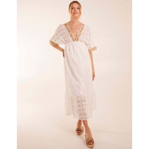 The dress that ticks all the boxes this season! With it's elegant detailing from embelishment to crochet. Along with its open tie up back. This dress will give you nothing but elegancy at any event. Blue Vanilla Women's V-Neck Short Sleeve Dress in Ivory Size: S/M