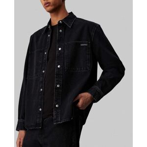 Mens Calvin Klein Regular-Fit Linear Denim Shirt in denim.- Pointed collar.- Branded metal snap buttons.- Patch chest pockets.- Barrel cuffs curved hem.- Calvin Klein logo patch on the chest pocket.- Mid-weight cotton denim.- Regular fit.- Ref: J30J3268351BY