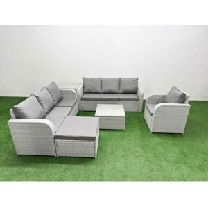 Important: Please put the gas fire pit on the glass top not under the glass .Do not cover the igniter with lava .please refer to the picture in the listing. we strongly recommend using 5 kg gas tank. Before using the fire pit ,please check it carefully if there is any leakage at the joint place or the hose . if the gas bottle is not fixed correctly or the hose has some leakage it may cause danger . Pls kindly leave your mobile number at checkout for not delaying your shipment . Set dimensions: • 1 x Reclining chairs Size: 74W x 69D x 79H cm • 2 x 3 Seater Sofa Size: 177W x 67D x 79H cm •1 x Big footstool :65L x 65W x 34H cm •2 x Side table :65L x 65W x 66H cm • 1 x Firepit Dining Table Size: 140L x 80W x 69H cm • Sofa Weight Capacity: 250kg • Table Weight Capacity: 80kg Light grey rattan with dark grey fabric .Color may vary due to light or monitor .we are unable to return the item due to this problem .Please contact us before purchase if you have requirements on color saturation .