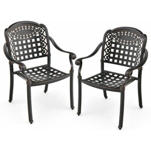 Complement your outdoor dining space with our cast aluminum patio chairs! After simple assembly, these outdoor dining chairs are ready to use. The backrests, armrests and seats are all curved, making you feel more comfortable. Whats more, the rustproof and sturdy cast aluminum not only assures you higher durability but shows you 165 kg strong bearing capacity. After using them, just stack these patio armchairs together for space-saving. Costway Set of 2 Cast Aluminum Patio Chairs Stackable Outdoor Dining Chairs with Armrest in Bronze