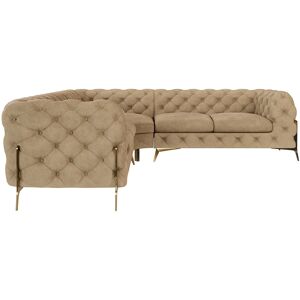 The Chesterfield L-shaped corner sofa with golden metal legs is a spacious and elegant solution for your living room. Crafted from high-quality velvet fabric, it offers not only an elegant look but also high comfort. The seat cushions are filled with premium foam padding and springs, providing a plush and supportive sitting experience. The classic Chesterfield design with button detailing on the front and back gives this corner sofa a timeless elegance. The golden metal legs in a shiny gold finish not only provide stability but also add a touch of glamour to the piece. This corner sofa offers generous seating for five people and is ideal for families or social gatherings. A stylish and comfortable piece of furniture that enhances your living space. Etta Avenue Upholstery Colour: Grey