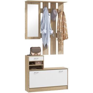 Keeping coats, bags, shoes, accessories and outerwear has never been so efficiently stylish. Crafted from particle board in a versatile natural wood and white finish, this HOMCOM 3-in-1 hallway organiser will keep your living space clutter-free. Alongside the six coat hooks, it features a pull-down shoe cabinet, a top drawer, a shelf for displaying ornaments and a handy mirror. You'll never misplace anything again! HOMCOM Hallway Furniture Set with Shoe Cabinet, Coat Rack & Mirror in Natural