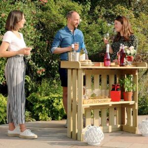 The Garden bar, is quick and easy to set up by simply opening the two main storage doors to make a sturdy base for the fold down counter which acts as a bar. Opening the side panel hinged doors reveals fully fitted cabinet shelving ready to display a range of drinks and glasses. Guests can sit comfortably at the bar by removing the two sturdy stools which are conveniently stored inside the base section. The two stools are stackable making more room for storage. The innovative design of the compact shape opens up to make a great entertaining space. When not in use, the stools are simply stored away, the bar counter and doors neatly folded back into place and secured with fasteners. Made from sustainable slow grown soft wood from responsibly managed forests and comes with a 10 year guarantee against rot. Handy shelves for glasses and bottles Neatly folds away when not in use Pressure Treated Timber 10 year guarantee against rot Made from sustainably sourced, slow grown softwood, from
