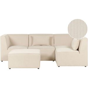 Modern 4 Piece Jumbo Cord Sectional Sofa with Footstool. Make your living room stylish and well-arranged with this modern sectional sofa. The corduroy upholstery is soft to the touch and features a striking ribbed texture, which gives it an elegant look, additionally the piece is supported by the legs made of synthetic material. The corner sofa consists of four modular sections, that you can put together or separately to make various configurations. The sofa comes with a multifunctional ottoman, use it as an extra seat, footrest or table. The additional cushions feature a removable cover that translates to easy cleaning without a worry for stains. Details: Product Type: Modular Sofa Style: Modern General Color: Beige Shade: Light Beige Material Type: Fabric Main Material: Corduroy Additional Material: Synthetic Material Filling Material: Foam Material Composition: 100% Polyester Shape: L-Shaped Arm Style: Track Fabric Upholstered Back: Yes Leg Caps/ Pads: No Orientation: Right Hand