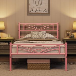 Graceful and sturdy, this metal bed frame features a sleek silhouette and cloud-inspired headboard. Crafted from durable metal with reinforced legs, it ensures stability without a bulky box spring. Non-slip foot caps and corner braces provide a quiet, restful sleep. The under-bed space keeps your bedroom tidy and organized. Yaheetech Size: Single (3'), Colour: Pink
