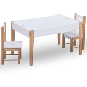 Creativity and fun made possible, thanks to the HOMCOM kids table and chairs! This three-piece set, suitable for nurseries, classrooms and playrooms, is both a reading space and a drawing haven with its innovative three-in-one tabletop design. Large storage options for all loose bits, keeping everything tidy and organised. The go-to set for every childhood, turning every day into a magical, imaginative adventure. Specifications: ● Colour: Natural Wood, White ● Material: MDF and nonwoven fabric ● Table dimensions: 48H x 61.5L x 61.5Wcm ● Chair: 53H x 28.5W x 30.5Dcm ● Storage space: 7.7H x 59L x 56.5Wcm ● Bookshelf: 15.5H x 59W x 7.2Dcm ● Seat height: 26cm ● Backrest: 26.5H x 26Wcm ● Storage drawer: 12H x 25L x 24.5Wcm ● Maximum load: Table: 20kg. Chair: 30kg. Drawer: 1.5kg. Bookshelf: 10kg ● Recommended age: 3-8 years ● Qualified age: 3+ years ● Qualification: EN71-1-2-3 ● Item label: 312-111V80ND Features: ● Includes two chairs and a table, suitbable for young children's spaces ●
