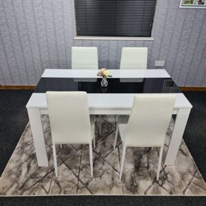 The dinner table set comes with 4 white gem pattern chairs. The table features a stunning white wooden surface with a striking black stripe painted in high UV painting The dining table colour is white with a striking black stripe. The dining chairs colour is black with diamond-stitched pattern on both the front and back The dinner table is crafted with high-quality MDF to ensure a durable, long-lasting tabletop. The dining chairs are constructed with premium leather Straightforward assembly is supported by clear instructions for our dining table set FEATURES: The Dining set includes a table, 4 high-quality chairs. Dining table made of high-quality MDF. Chairs material is premium leather with metal chair legs. Legs prevent damage with the adjustable foot protection provided. Chair Size: H85 x L52 x W44 cm. Table Size: H75 x L117 x W77 cm. The seat height of these chairs is 44 cm. Convenient format with instructions for easy assembly. KOSY KOALA White Black Wood Dining Table with 4 Leather Black Chairs Dining Room