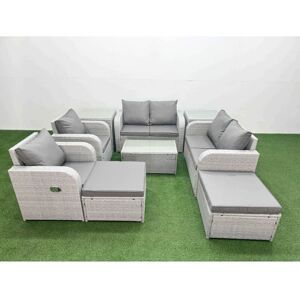 Important:Please put the gas fire pit on the glass top not under the glass .Do not cover the igniter with lava .please refer to the picture in the listing. we strongly recommend using 5 kg gas tank. Before using the fire pit ,please check it carefully if there is any leakage at the joint place or the hose . if the gas bottle is not fixed correctly or the hose has some leakage it may cause danger . Pls kindly leave your mobile number at checkout for not delaying your shipment . Set dimensions:2 x Reclining chairs Size: 74W x 69D x 79H cm 2 x Love Sofa Size: 124W x 67D x 79H cm 2 x Big footstool 65L x 65W x 34H cm2 x Side table 65L x 65W x 66H cm 1 x Firepit Dining Table Size: 140L x 80W x 69H cm Sofa Weight Capacity: 250kg Table Weight Capacity: 80kg Light grey rattan with dark grey fabric .Color may vary due to light or monitor .we are unable to return the item due to this problem .Please contact us before purchase if you have requirements on color saturation . The 2 armchairs are adjustable, you can adjust the inclination of the chair back from 90-130 through the button . Items Comes Flat Packed And Easy to Assemble, Sturdy Galvanized Steel Tube Metal Frames With Powder Coating To Prevent The Rust Ergonomic High Back And Declining Design For Extra Comfort Flat PE Rattan Completely Made By Hand, 5mm Thick Transparent Tempered Glass With Sucker On Surface To Prevent Sliding8 CM Thick Seat Cushion With Soft Back Cushion Gives You More Comfort. Low Maintenance ,Removable Cushion Cover And Easy Move To Different Place. Pls Keep the Cushion Indoor Or put on With Rain Cover When Not In Use . put on The Furniture With Rain Cover If Not in Use For Long Time . Factory Direct Sale Guarantee The Quality And After Sale Service. Important notice: pls check the product carefully before signing it .if there is any obvious damage when arrive ,pls kindly mark on the receipt .we will file claim to the courier and send the replacement .thank you This item is for kerbeside delivery , we can't deliver to your room . WARRANTY&SUPPORT:Though we have nearly 100% checked before shipment , but as this item is 100% handmade so If you have any issues of assembly, missing parts, damaged or other problems of product quality of this outdoor rattan furniture set, please feel free to contact us, and our after-sales team will respond within 24 hours and offer you the most perfect and powerful solutions. Fimous 8 Seater Outdoor Reclining Chair Love Sofa Set Rattan Garden Furniture Set with Firepit Dining Table 2 Big FootStools 2 Side Table Light Grey