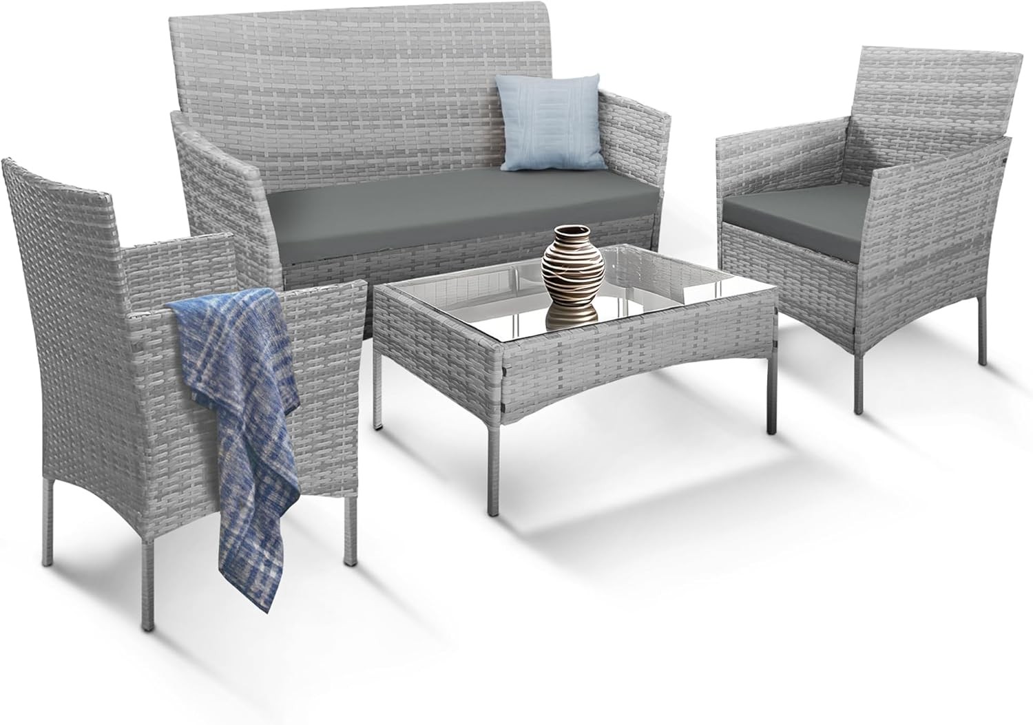 KEPLIN 4 Piece Rattan Garden Furniture Set – Outdoor Sofa, 2 Chairs & Tempered Glass Coffee Table, Durable Weather-Resistant Wicker Patio Lounge Set with Cushions for Garden, Balcony & Patio (Grey). Manufacturer Keplin.
