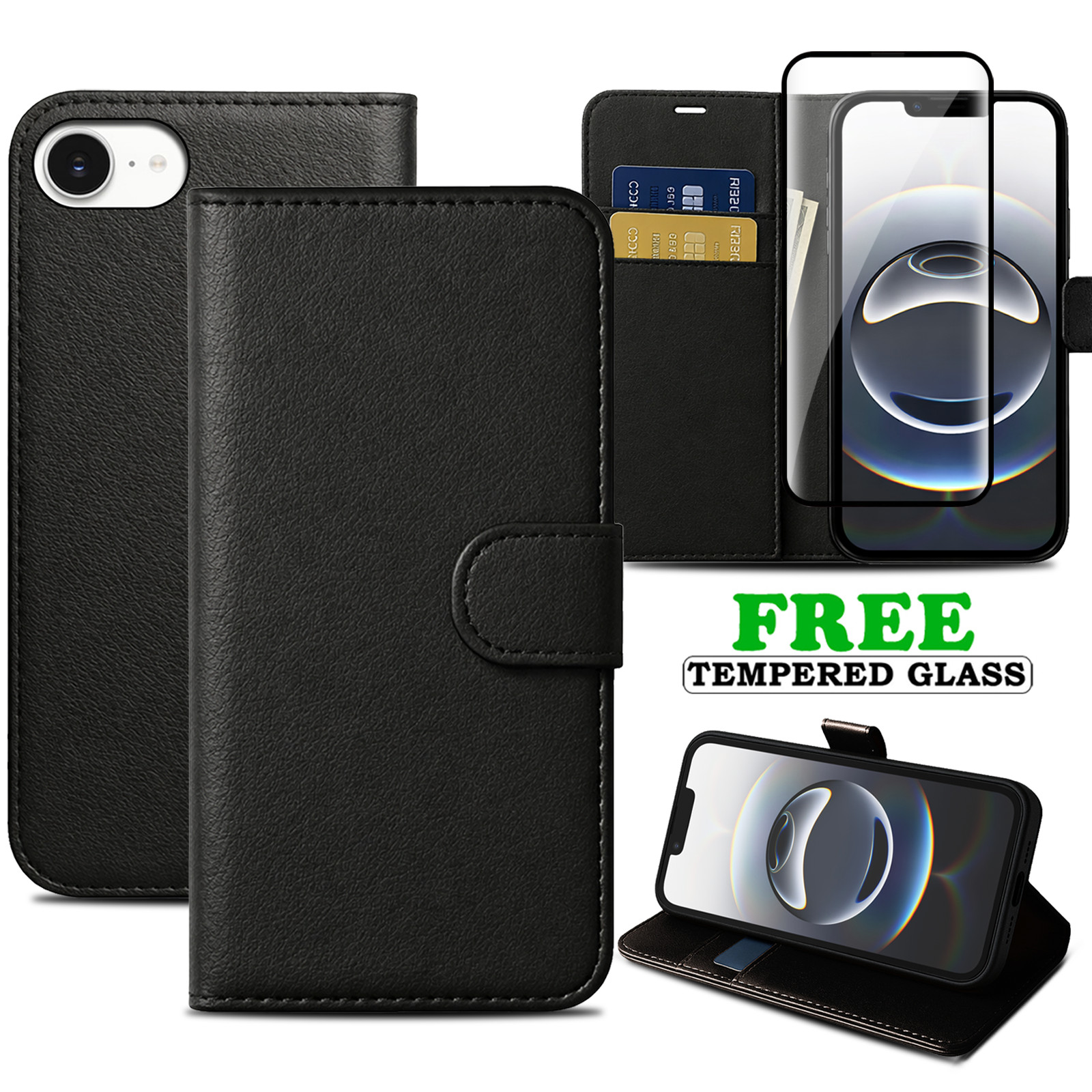 Compatible with Apple iPhone 17e,16e. Leather Wallet Case. 1x Leather Wallet Case Cover with Free Full Curved Tempered Glass. Reinforced stitching enhances durability.
