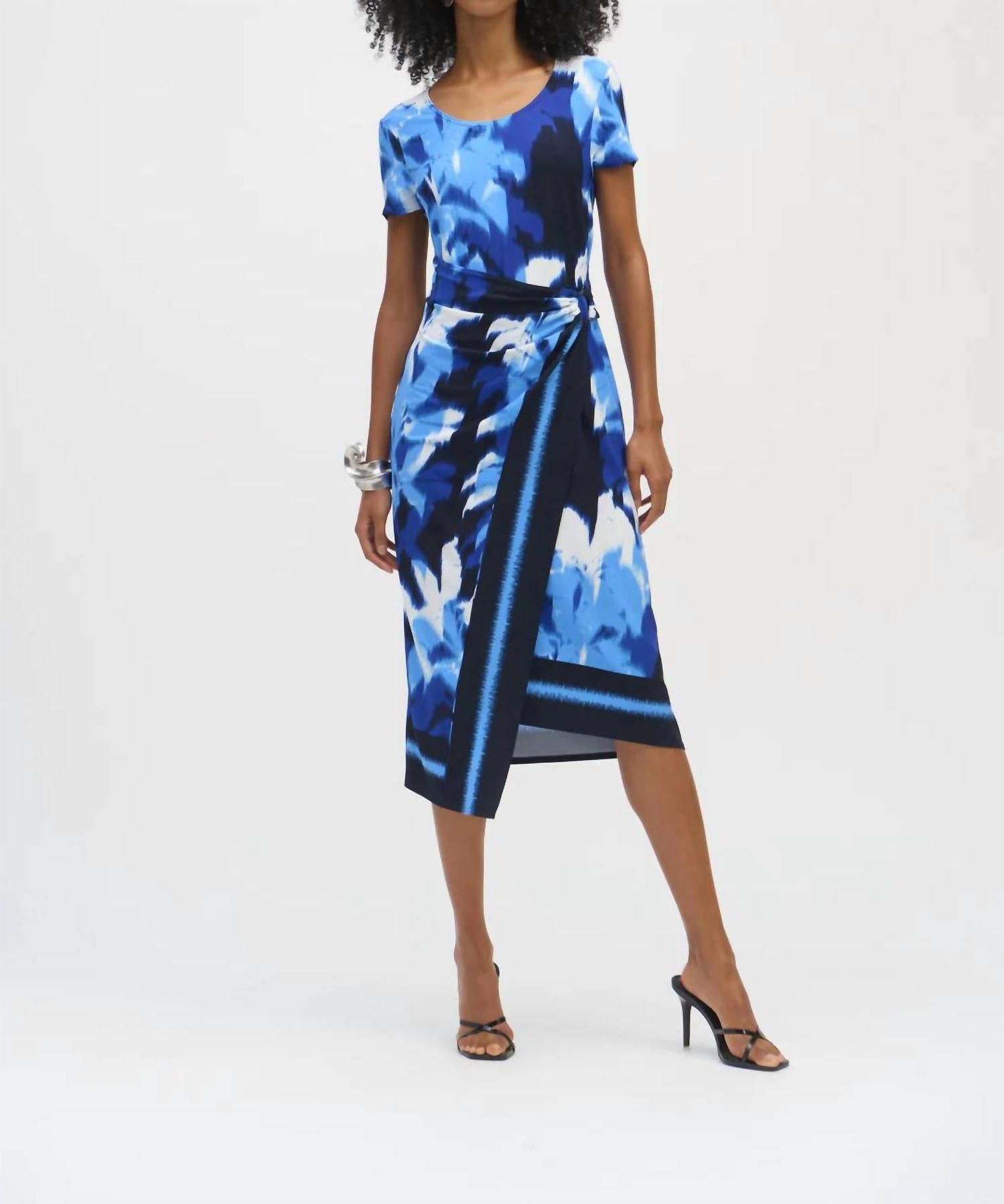 A midi dress so versatile, your options for wearing it are endless.Introducing the Joseph Ribkoff Tropical Print Asymmetrical Dress, a chic addition to your summer wardrobe in a stunning blue and vanilla pattern. This dress features short sleeves and a scoop neckline, crafted from 95% polyester and 5% spandex. Designed and made in Canada, this knee-length dress has a pull-on closure and a stylish O-shaped ring at the waist. Care for this elegant piece with a hand wash in cold water and line dry as per instructions. Color: Blue/vanilla No offers or bids: all items are already at max discount Final Sale No Returns or Exchanges!
