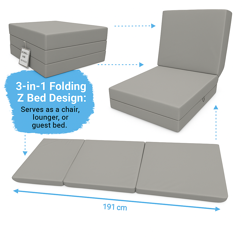 A versatile 3-in-1 design that transforms from a comfortable chair into a lounger or guest bed in seconds. 3-in-1 Folding Design: Easily converts between chair, lounger, and single bed – ideal for guests or small spaces.