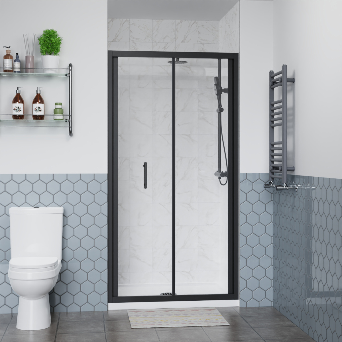 Pivot Shower Door. Galvanize top double wheels & bottom jump double wheels, smooth sliding and long lasting. Shower door/Shower screen options. Bathroom Furniture. Matte black aluminum flat profile. Tempered safety glass with easy clean coating.