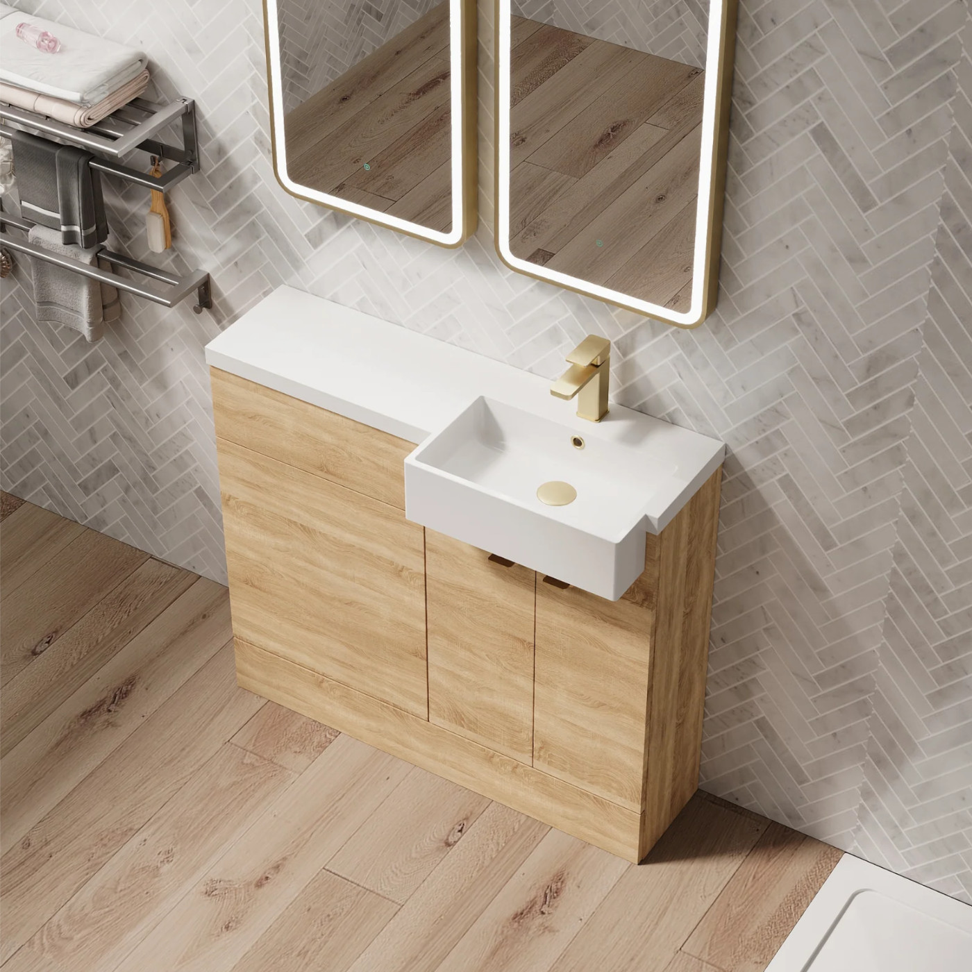 Introducing the Hudson Reed Fusion 1000mm Semi-Recessed Combi Vanity and WC Unit Back to Wall Pan. This modern unit is perfect for any bathroom with its sleek design and Bleached Oak finish. It features hidden storage, an square shaped basin, and soft closing doors with wrapover handles in a stylish Brushed Brass finish.