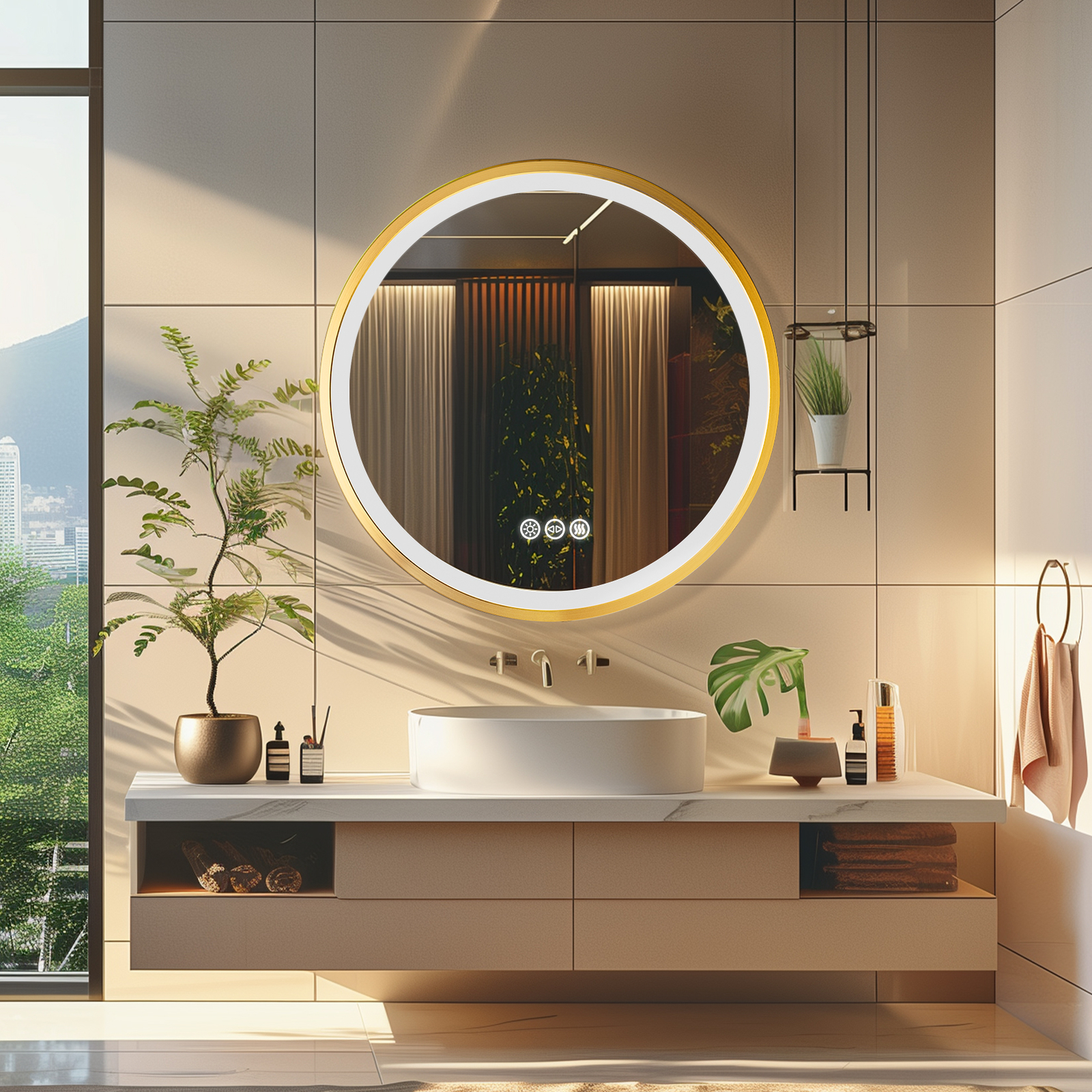 24" Round Illuminated LED Bathroom Mirror Gold Aluminum Frame Dimming Defogging
