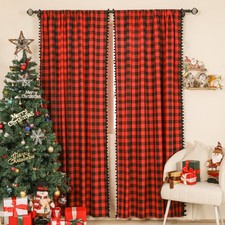 Buffalo Plaid Window Curtains for Living Room Pom Pom Rustic Farmhouse Red Bl...