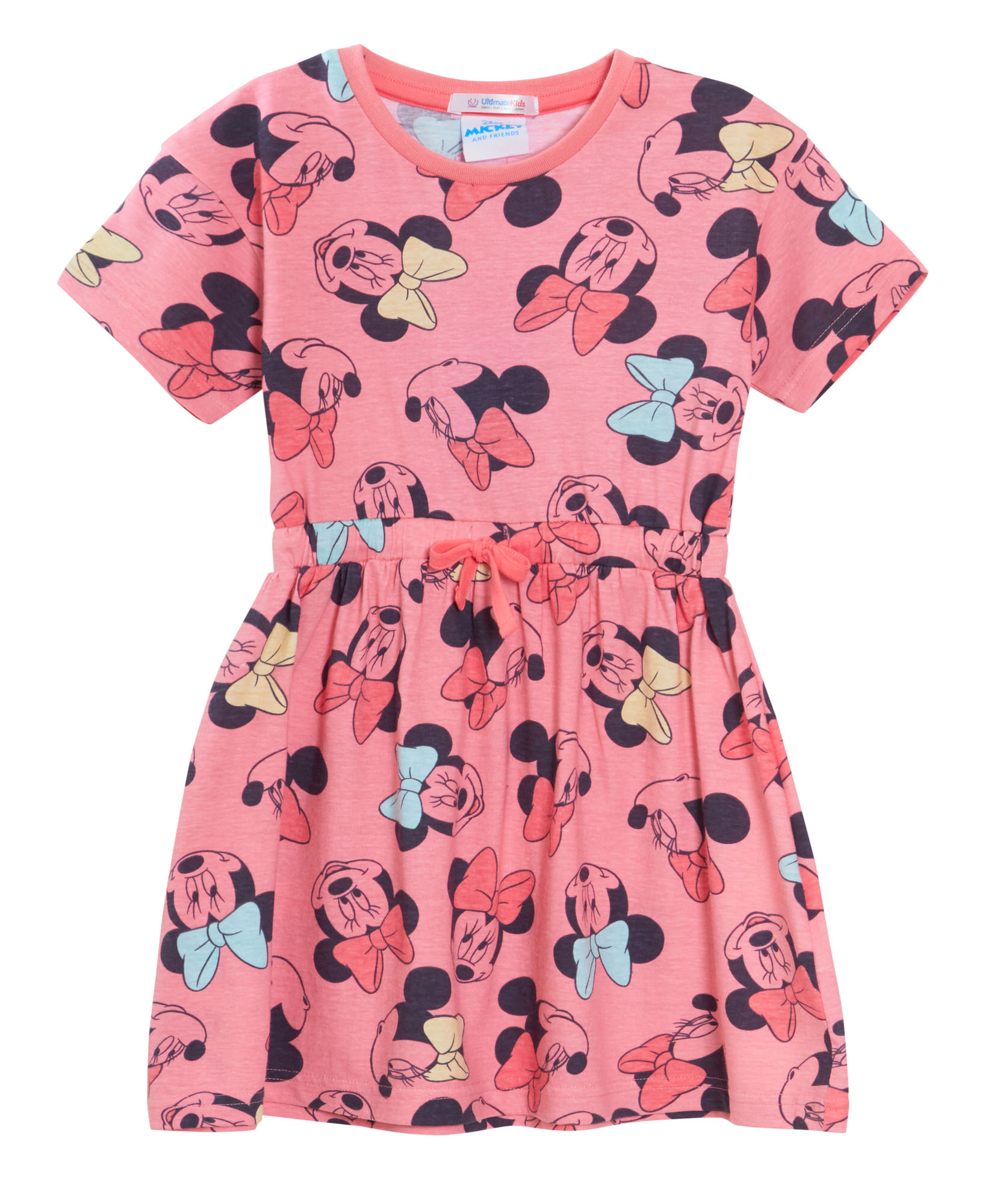 These fun new dresses are made from super soft, 100% cotton material and are machine washable. Each dress is short sleeved, knee length with tie drawstring waist and includes cute character images of the muched loved Disney character Minnie Mouse in a pink design.