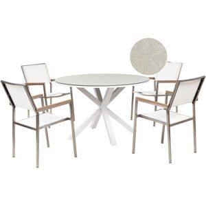 Stylish Garden Dining Set. This stylish garden dining set includes a spacious round table and four chairs, making it ideal for those who love hosting gatherings. The table, crafted from lightweight yet robust aluminium with a ceramic glass table top and marble effect, offers ample space for dining essentials, and sturdy stainless steel chairs with a fabric seat guarantee comfort. Its neutral colour palette provides versatile styling options, and UV, light water, stain, and rust-resistant materials ensure durability. Details: Product Type: Dining Set Style: Modern General Color: White, Silver, Grey Shade: White Marble Material Type: Metal Main Material: Aluminium Additional Material: Plastic Wood Top Material: Metal Finish: Powder Coated Seats Up To: 4 People Dimensions: Chair Dimensions: 55x58x87 cm Seat Height: 44 cm Table Dimensions: 120x120x75 cm Overall Dimensions: 120x120x75 Weight: 54 kg Chair Weight Capacity: 160 kg Table Weight Capacity: 70 kg Offer Includes: 4 x Chair, 1 x