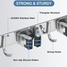 General description Make your life organized with this sturdy and versatile Mop Broom Holder Wall Mount. Ideal for use in broom closets, kitchens, garages, and gardens, this space-saving storage solution helps you say goodbye to mess forever. Technical specifications Material: 304 Stainless Steel Size: 8.5 x 6.5 cm / 3.3 x 2.6 inches Color: Silver Weight capacity: Holds up to 10 kg Installation Easy to install with strong self-adhesive backing Simply stick on the wall for a secure hold Usage Suitable for hanging brooms, mops, rakes, rags, brushes, dustpans, gloves, dusters, and baseball bats Waterproof, moisture-proof, rust-proof, and anti-corrosion, making it suitable for both indoor and outdoor use Other information Features triangle-buckle and petal-shaped gear that automatically adjusts to different handle thicknesses to prevent slipping Package includes: 5 Mop Broom Holders