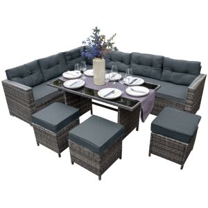 Experience luxury in its finest form with our stunning 9-seater rattan furniture corner set from the sensational Jardí range. Designed for maximum style and comfort, this exquisite dining set is made up of a corner sofa, 3 x stools and a glass top table. Able to comfortably seat nine people, this set is sure to be the perfect centrepiece for any garden party or dining al fresco. Finished in a striking grey and complemented with extra thick beautiful grey cushions, the set brings a modern and luxurious touch to your garden. With the addition of a protective UV-layer, you can be assured your furniture will be shielded from the elements all year round, helping to maintain its beautiful colour. With practicality in mind, the waterproof cushions have removable and washable covers for your ease and convenience to keep them looking like new. And with the high-quality rain cover provided you can protect your furniture in wet and rainy conditions – no need to move your dining table and chairs