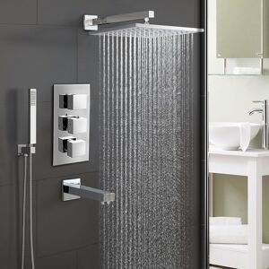 GENERAL DESCRIPTION This thermostatic mixer valve set includes a shower head, body jets, and a thermostatic valve. It is designed for high-quality performance and durability. TECHNICAL SPECIFICATIONS Top Dial - Controls water to 1 outlet diverter Middle Dial - Temperature Control Bottom Dial - Controls water to 2 outlet diverters High Quality Design Chrome Finish Thermostatically controlled Manufactured from highly durable brass Operating range 20 - 50 deg C with 38 deg C safety button Built in non return valves to prevent back flow Chosen temperature maintained to within +/-1ºC Pre-set maximum temperature Automatic shut off in event of water cold supply failure UK standard size fitting 200mm square shower head with high shine chrome finish Chrome plated square body jets Standard 1/2' connection COMPATIBILITY AND ACCESSORIES 1 X Thermostatic valve 1 X Shower head 1 X Shower arm 6 X Body jets 1 X Shower hose 1 X Handset 1 X Bracket INSTALLATION Our thermostatic showers require a