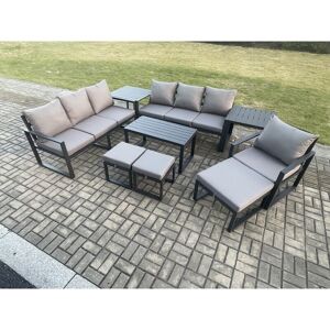 This aluminum gas fire pit sofa dining set can accommodate 10 peoples and has a comfortable and soft cushion back, being made of high quality Alloy aluminum and durable powder coating for sturdiness and structural durability. that will withstand our British weather of rain, wind and sun. The cushions are premium quality, super thick, with washable covers. Set Dimensions: 1 x Left Sofa with single armrest: 125W x 70D x 78H cm; 1 x Right Sofa with single armrest: 125W x 70D x 78H cm; 1 x Corner Sofa70L x 70W x 78H cm; 2 x Armless Sofa Size: 60L x 70W x 78H cm; 3 x Chair Size: 74L x 70W x 78H cm; 1 x Dining table with fire pit: 140L x 80W x 70H cm (Aluminum table top Without glass) Dark grey powder coated with dark grey fabric .Color may vary little due to light or monitor .we are unable to return the item due to color problem. please contact before purchase if you have requirement on color saturation. the product is delivered on pallet, to kerbside only. Fimous Aluminium 9 Pieces Garden Furniture Corner Sofa Set with Cushions Gas Fire Pit Dining Table Set Gas Heater Burner Dark Grey
