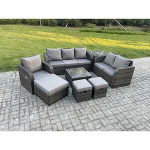 This PE rattan outdoor furniture set is a great addition to patio or garden, made of high quality PE rattan and durable galvanized steel construction for sturdiness and long lasting.Durability,and this garden furniture set can be put Outdoor all year round. Set Dimensions: • 1 x Side coffee table :65L x 65W x 66H cm • 1 x Big footstool :65L x 65W x 34H cm • 2 x Fully Assembled small footstools:40L x 40w x 34H cm • 1 x Reclining Chairs: 74L x 67W x 79H cm • 2 x Love Sofa Size: 124W x 67D x 79H cm • 1 x Square Coffee Table :65L x 65W x 34H cm Dark grey mixed rattan with dark grey fabric .Color may some difference due to light or monitor .we are unable to return the item due to color problem . The armchair are adjustable, you can adjust the inclination of the chair back from 90°-130° through the button . Items Comes Flat Packed And Easy Assemble,Sturdy Galvanized Steel Tube Metal Frames With Powder Coating To Prevent The Rust Flat PE Rattan Completely Made By Hand, 5mm Thickness