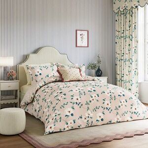 An effortlessly sophisticated print, this trailing dog rose is hand painted to create a timeless cottage garden feel. With easy access to pollen rich stamens, dog rose is a particular favourite with bees and insects alike, creating an enticing and welcoming floral habitat that has been effortlessly translated onto bedding for this Sanderson x National Trust collection. Sweet, open roses in a soft white, bloom against a blush backdrop with a stripe design on the reverse in this matching duvet and Oxford edge pillow set. Produced in 100% cotton percale. Each pillowcase features the hand painted trailing dog rose design on the front and reverse for the most elegant bedding set. Machine washable. King Size duvet cover: 230cm x 220cm.