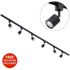 Inspire a minimalistic look into your home with the 2 Metre Track Light Kit with 4 Soho Heads and LED Bulbs in Black. Featuring four Soho-style spotlight heads, this track light kit offers adjustable spotlights so that you can manipulate the direction of light to suit your needs. The sleek black finish would look ideal in monochromatic homes. Kit includes: 4x heads, 4x LED Bulbs, 2x 1 metre track, 1x butt connectors Perfect solution for kitchens, dining rooms, hallways and office space Customise the position and number of spot heads for practical, directional lighting The spotlight heads are compatible with LED or halogen bulbs (GU10) Create Straight or L-Shaped variations to suit your room using the connectors Product Type: Track Light Spot Head Colours: Black Light Bulb Type: GU10 Bulbs Required: 4 (Included) Bulb Wattage: 8 Watt Light Source: LED Length: 2 Metre Width: 3.3 cm approx. Material: Metal Technical Information *For bulb colour temperature details, please contact us.