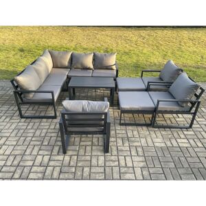 This 9 Pieces aluminium Outdoor garden furniture set can be used both indoors and outdoors,with high quality aluminium Frame construction for sturdiness and long lasting. it can also be placed on the patio or balcony,The design of this patio lounge sofa set is a perfect blend of country chic and modern minimalism, adding an elegant touch to your house. Set Dimensions: • 1 x Left Sofa with single armrest: 125W x 70D x 78H cm • 1 x Right Sofa with single armrest: 125W x 70D x 78H cm • 1 x Corner Sofa:70L x 70W x 78H cm • 1 x Armless Sofa Size: 60L x 70W x 78H CM • 3 x Chair Size: 74L x 70W x 78H cm • 1 x Big footstool :60L x 60W x 35H cm • 1 x Square Coffee table : 60L x 60W x 35H cm Dark grey powder coated with dark grey fabric .Color may vary little due to light or monitor .we are unable to return the item due to color problem .please contact us before purchase if you have requirement on color saturation. Items Comes Flat Pack And Easy Assemble, Alloy Aluminium Frame With Powder
