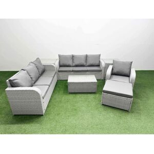 This deluxe PE rattan sofa set is a great addition to patio or garden, made of high quality PE rattan and durable galvanized steel. Pls kindly leave your mobile number at checkout for not delaying your shipment . Set dimensions: • 1 x Reclining chairs Size: 74W x 69D x 79H cm • 2 x 3 Seater Sofa Size: 177W x 67D x 79H cm •1 x Big footstool :65L x 65W x 34H cm •1 x Side table :65L x 65W x 66H cm • 1 x Table Size: 65L x 65W x 34H cm • Sofa Weight Capacity: 250kg • Table Weight Capacity: 80kg Light grey rattan with dark grey fabric .Color may vary due to light or monitor .we are unable to return the item due to this problem .Please contact us before purchase if you have requirements on color saturation . The 2 armchairs are adjustable, you can adjust the inclination of the chair back from 90°-130° through the button . Items Comes Flat Packed And Easy to Assemble,Sturdy Galvanized Steel Tube Metal Frames With Powder Coating To Prevent The Rust, Ergonomic High Back And Declining Design For